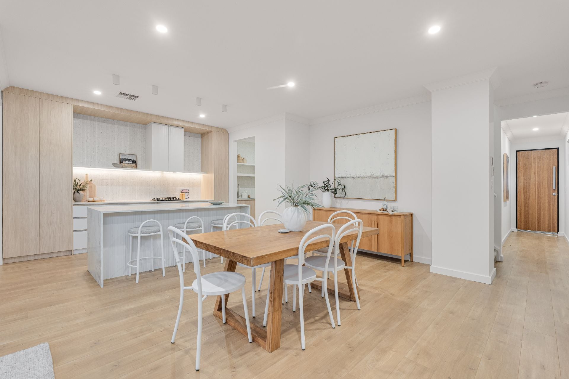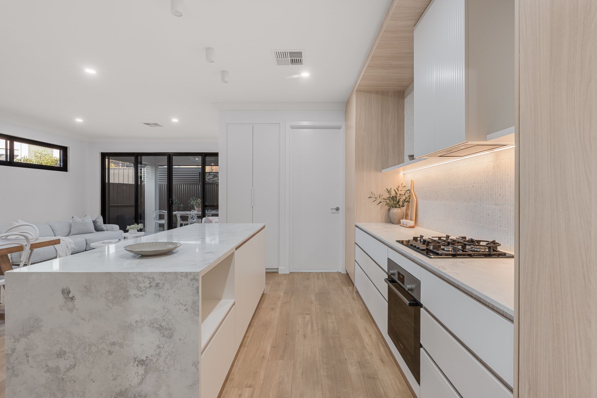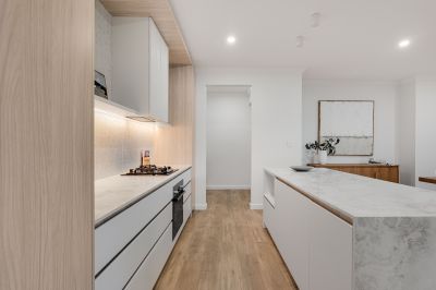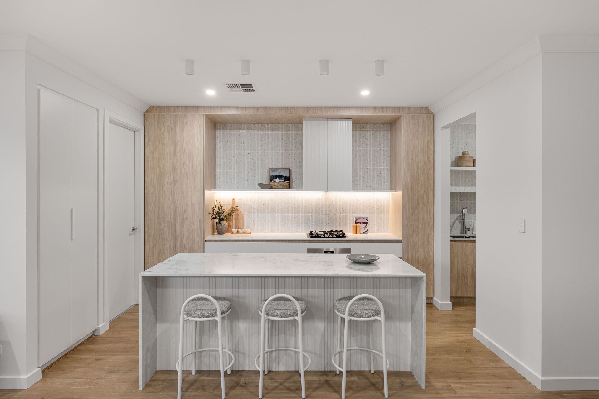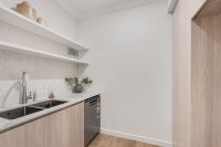 The kitchen is a standout feature, showcasing contemporary timber-look cabinetry, stone benchtops, and premium BOSCH appliances. A generous walk-in pantry provides additional storage and preparation space, while the clean lines and neutral palette deliver a timeless, high-end aesthetic.