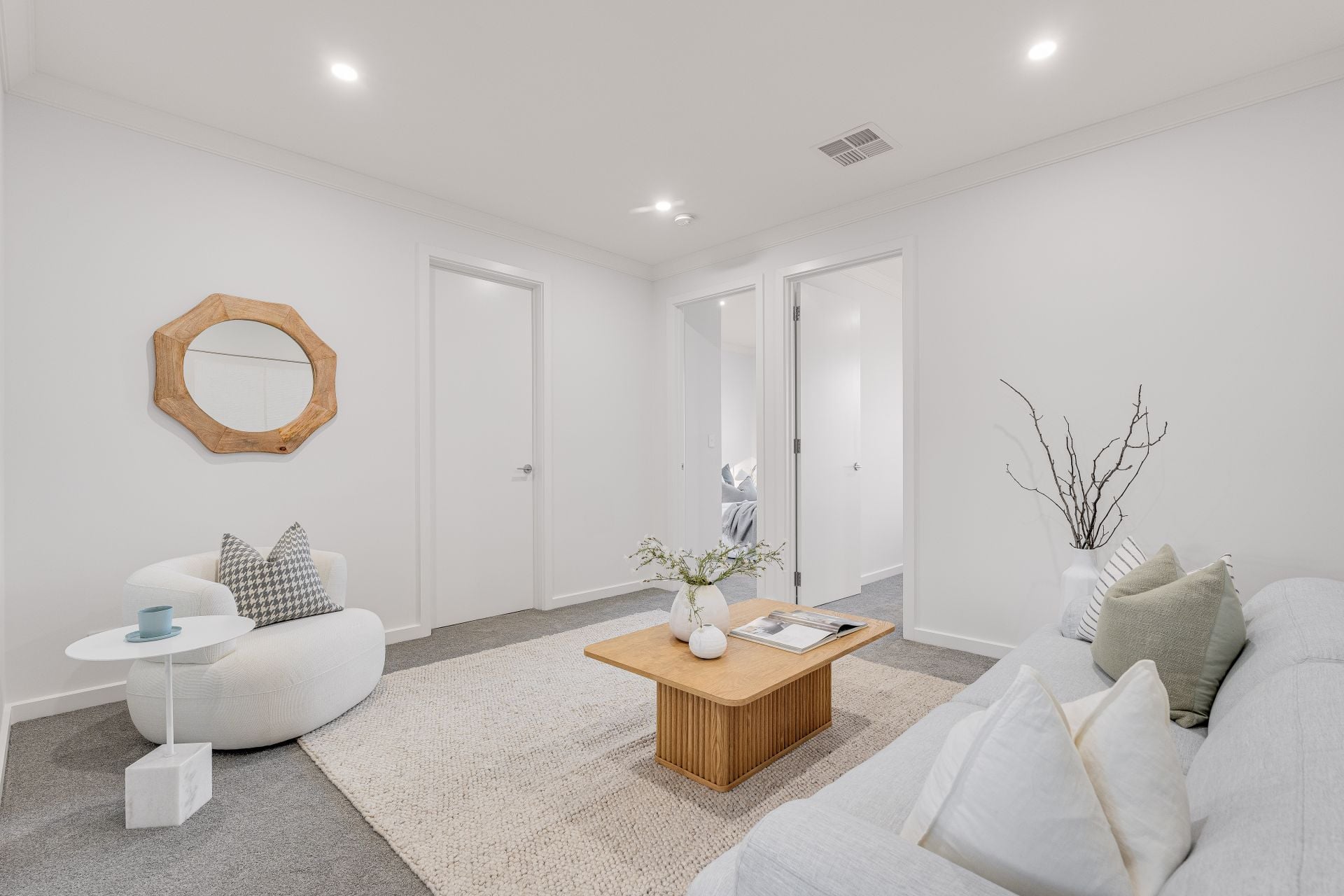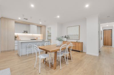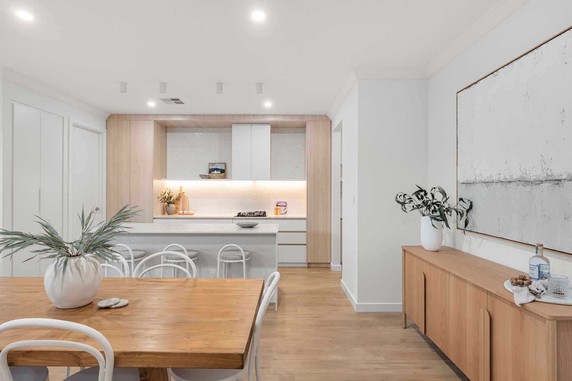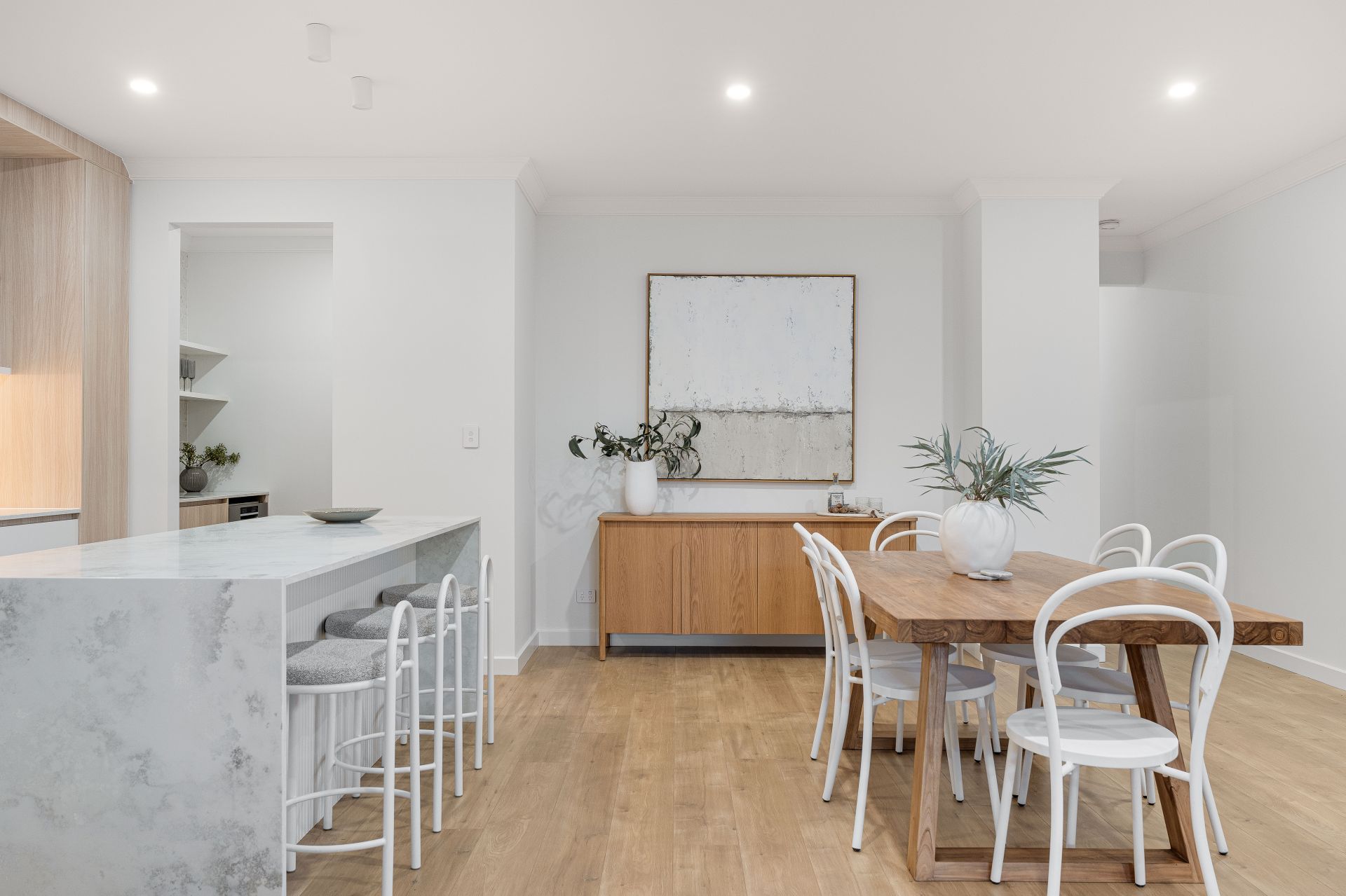 The kitchen is a standout feature, showcasing contemporary timber-look cabinetry, stone benchtops, and premium BOSCH appliances. A generous walk-in pantry provides additional storage and preparation space, while the clean lines and neutral palette deliver a timeless, high-end aesthetic.