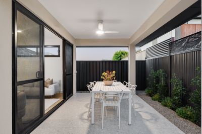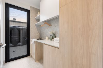 Outdoors, the low-maintenance alfresco area is enhanced by exposed aggregate finishes and supported by a 2000L rainwater tank, combining sustainability with modern design. Completing the home is a double garage with internal access and additional storage space, providing practical functionality for modern living.