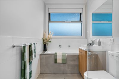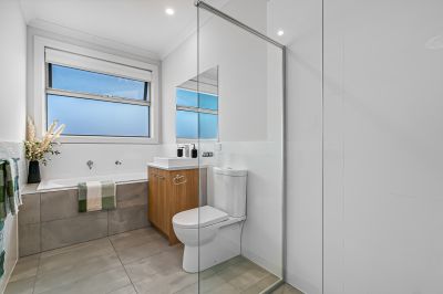 Upstairs, you'll find three generously sized bedrooms. The master suite features an expansive his-and-hers walk-in robe leading to a beautifully designed ensuite. Bedrooms two and three, both with mirrored built-in robes, exude comfort with plush carpeting and a refreshing white palette. A spacious main bathroom with a separate bathtub and shower conveniently serves these bedrooms.