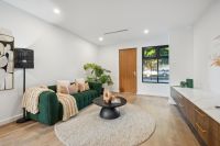 The designer kitchen is nothing short of stunning, featuring a sleek island breakfast bar under an elegant pendant light. The glass window splashback offers serene views of the backyard, while providing an abundance of natural light. Equipped with premium Smeg appliances-including a 900mm 5-burner cooktop, oven, rangehood, and dishwasher-this kitchen is as functional as it is beautiful. The stone waterfall edge benchtops and custom 2-pac cabinetry lend an air of refined luxury, while a built-in stone TV cabinet in the lounge room completes the living area's stylish aesthetic.