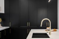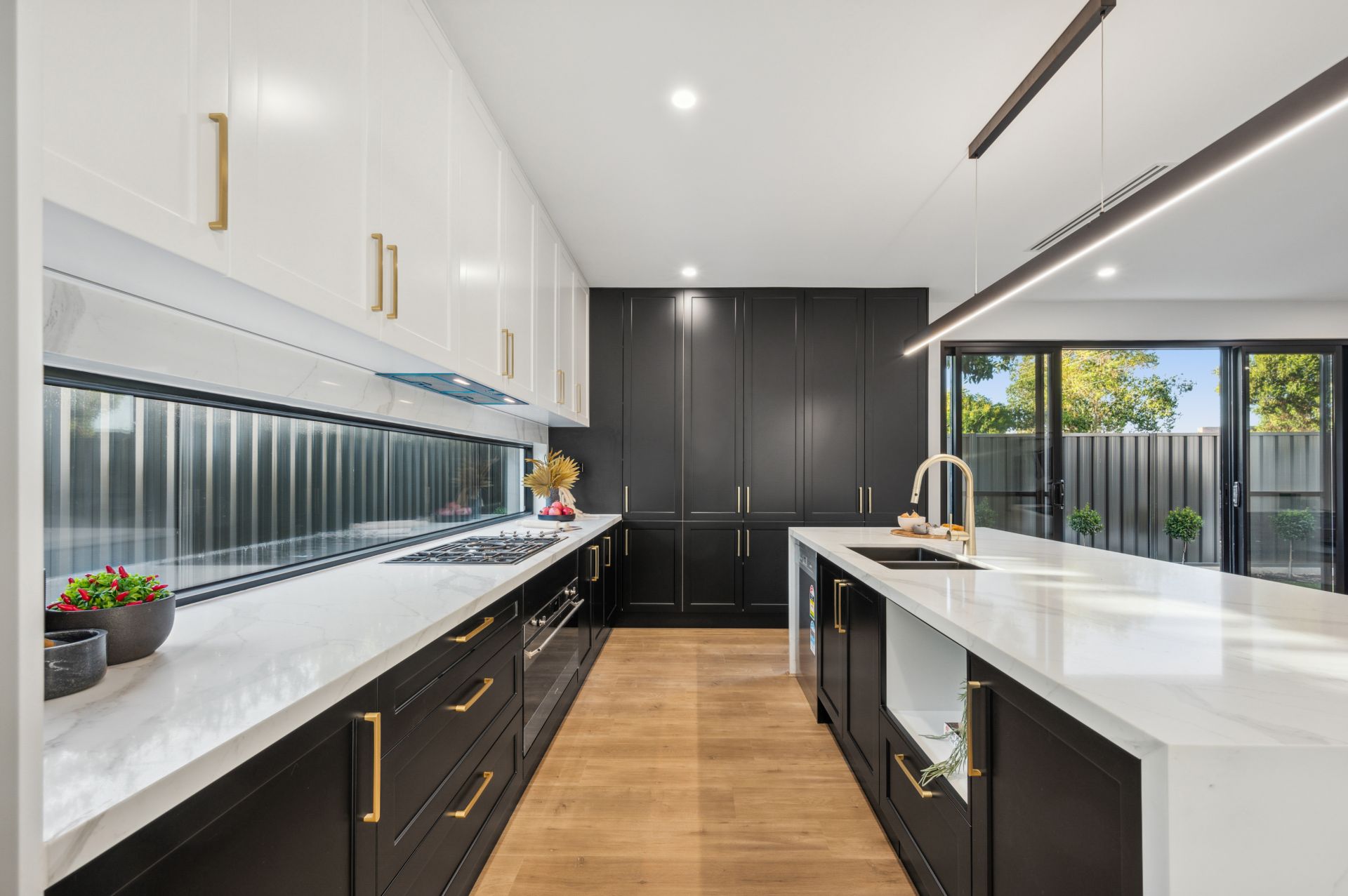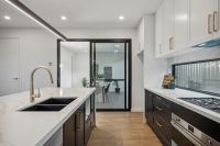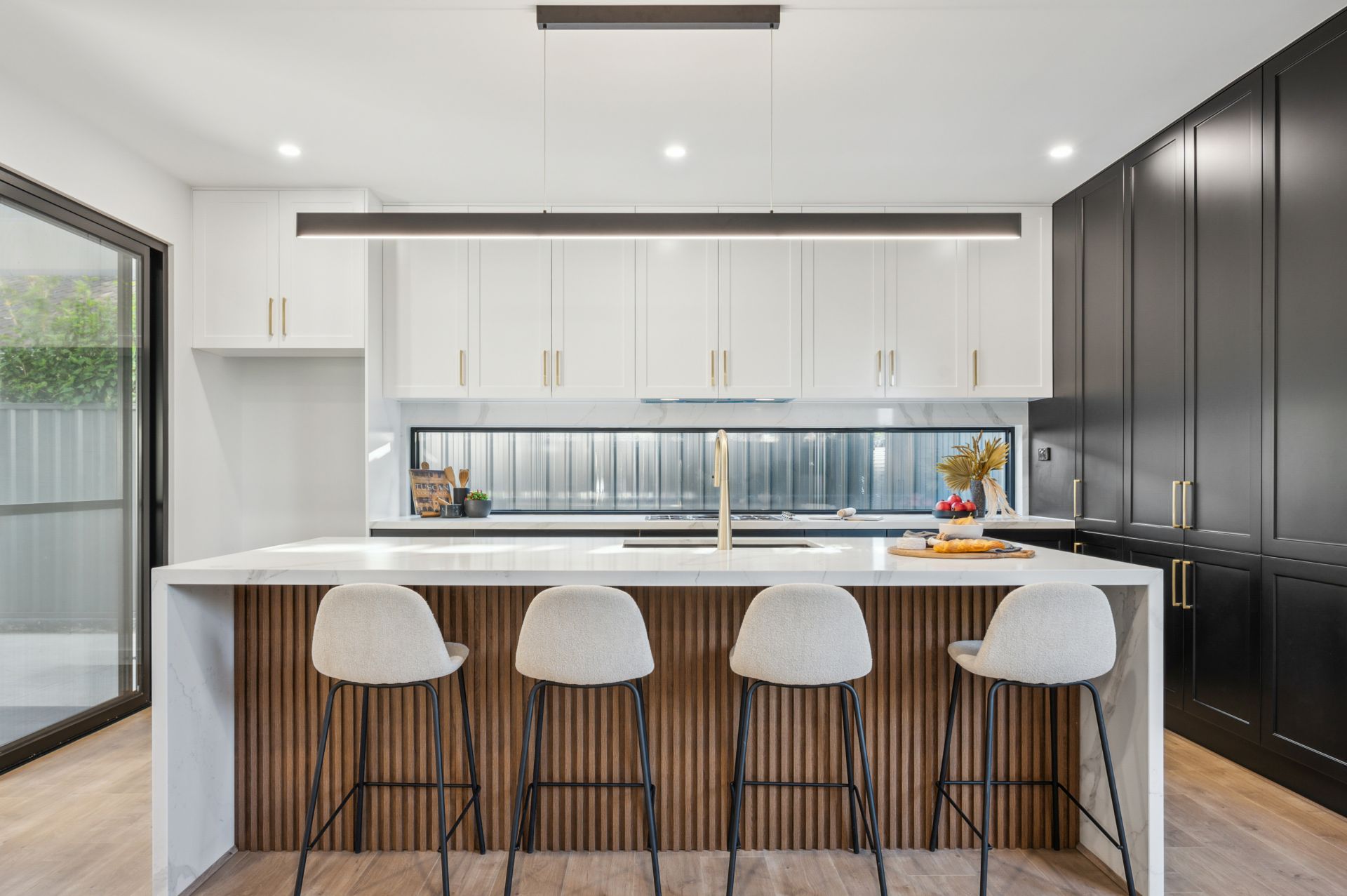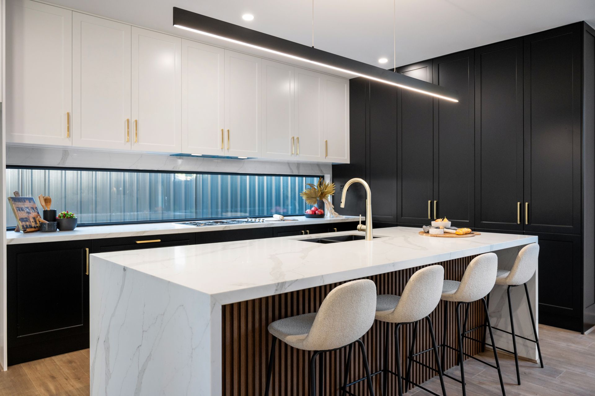 - Architecturally designed kitchen featuring a 40mm stone waterfall edge benchtop, undermount sink, superabudant storage, matte black cabinetry, a 2m LED strip pendant light, and a glass splashback that beautifully frames views of the backyard.