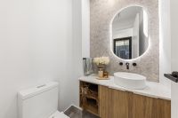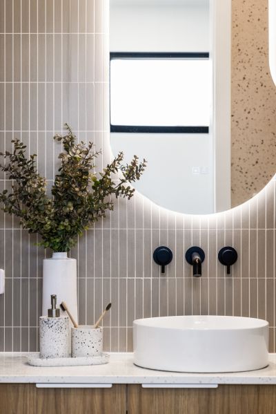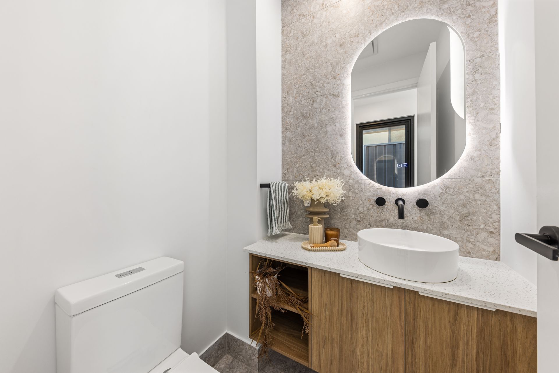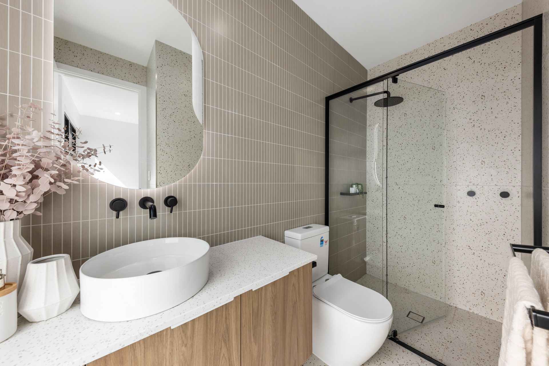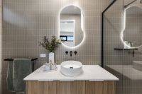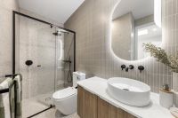 - Designer bathrooms featuring matte black tapware, LED backlit mirrors & stone-top vanities