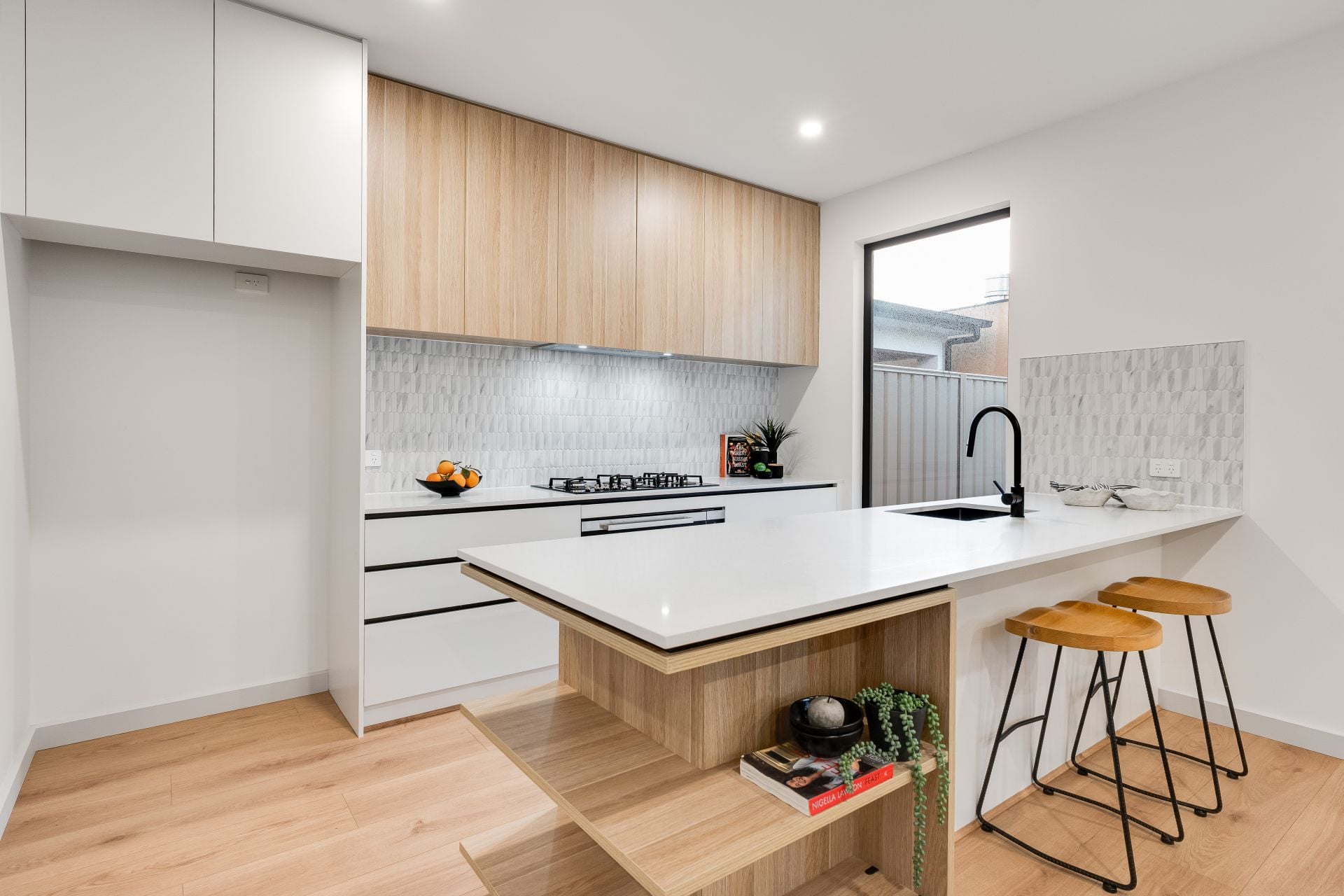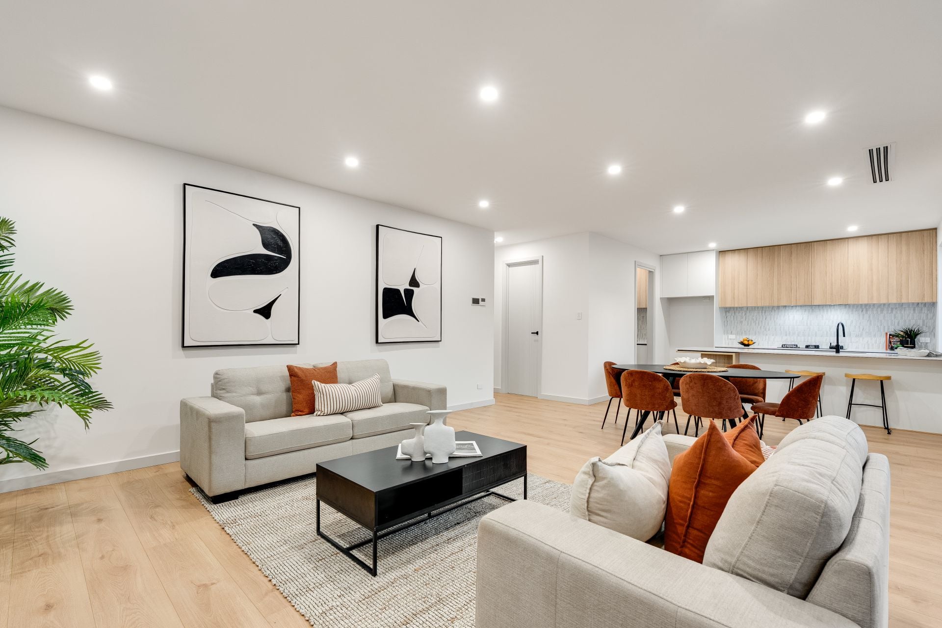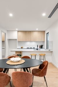 Crafted for contemporary living, the home reveals a seamless open plan layout bathed in natural light, where clean lines, warm textures and elegant finishes come together to create a space that feels both elevated and inviting. Almost floor to ceiling windows flood the interiors with natural sunlight, enhancing the sense of space and connection throughout.