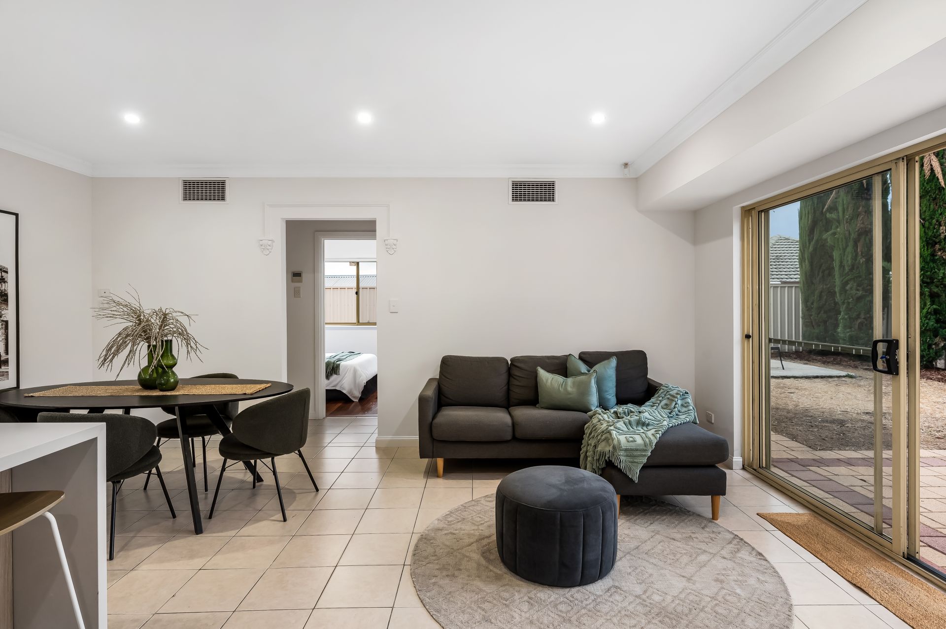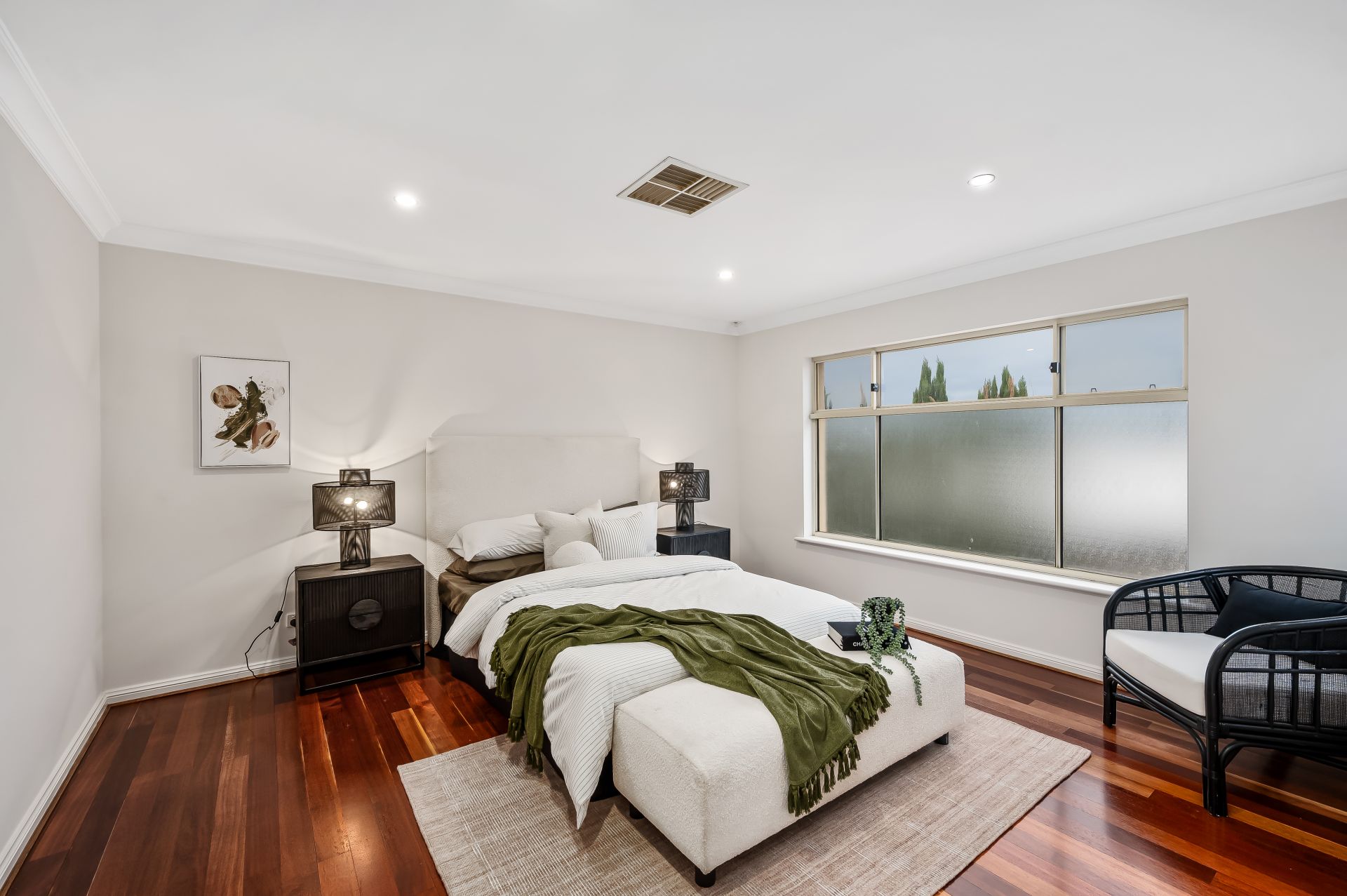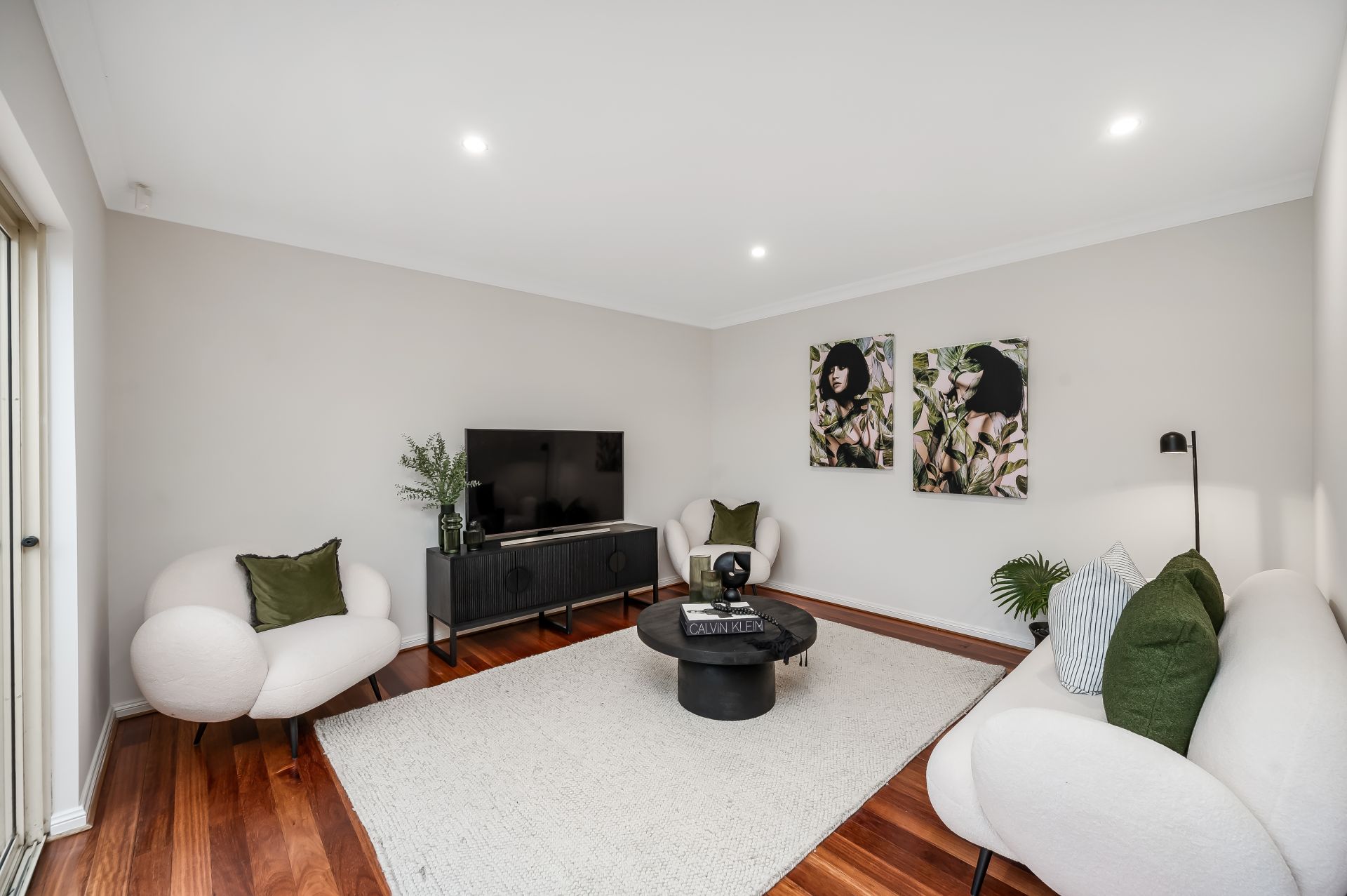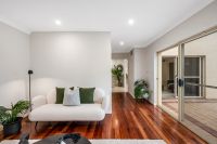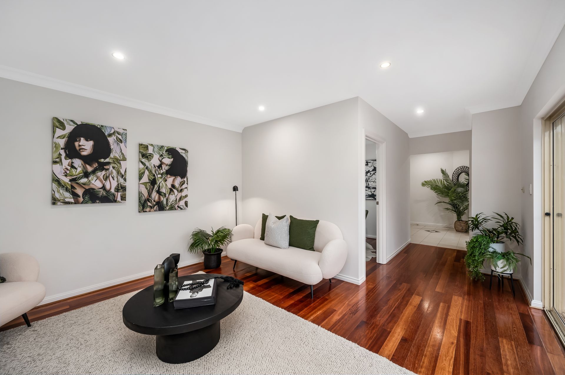 - Large living room/home theatre with polished timber floors, recessed downlights, and access to the rear patio
