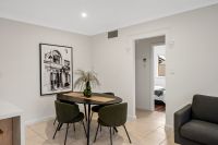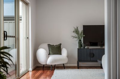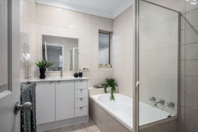 Beyond the central living area, a separate hallway leads to two generously sized bedrooms. Both rooms are equipped with timber floors, and bedroom 2 also boasts a built-in robe for added storage. These rooms share a beautifully appointed bathroom, tiled to the ceiling and featuring a bathtub, separate shower, and stone-topped vanity unit. Adjacent to the bathroom is a separate toilet, plus a laundry room with built-in cupboard space, a trough, and external access to the clothesline.