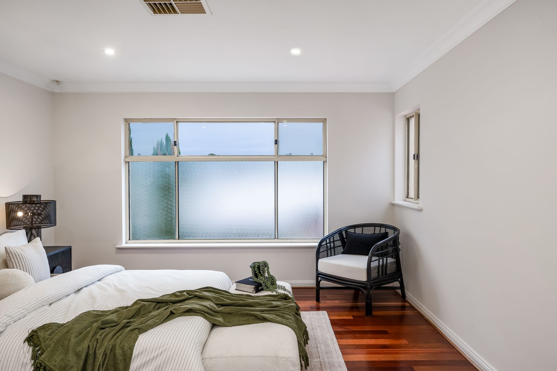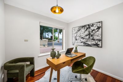To the right of the foyer, you'll find the enormous living room or home theatre, an ideal space for relaxing or entertaining guests. This room features gleaming polished timber floors, recessed down lights, and a large glass sliding door that opens out onto the rear paved patio and lush gardens, creating a seamless indoor-outdoor living experience. This level also includes a versatile fourth bedroom, perfect for a guest room or home office.