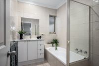 - Downstairs bathroom featuring a tub, separate shower, and stone-topped vanity unit