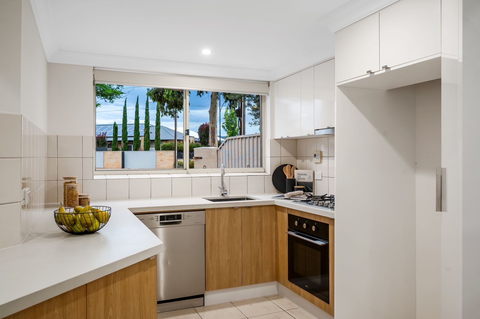 - Stainless steel under-bench oven, gas cooktop, and retractable rangehood, offering a functional cooking space